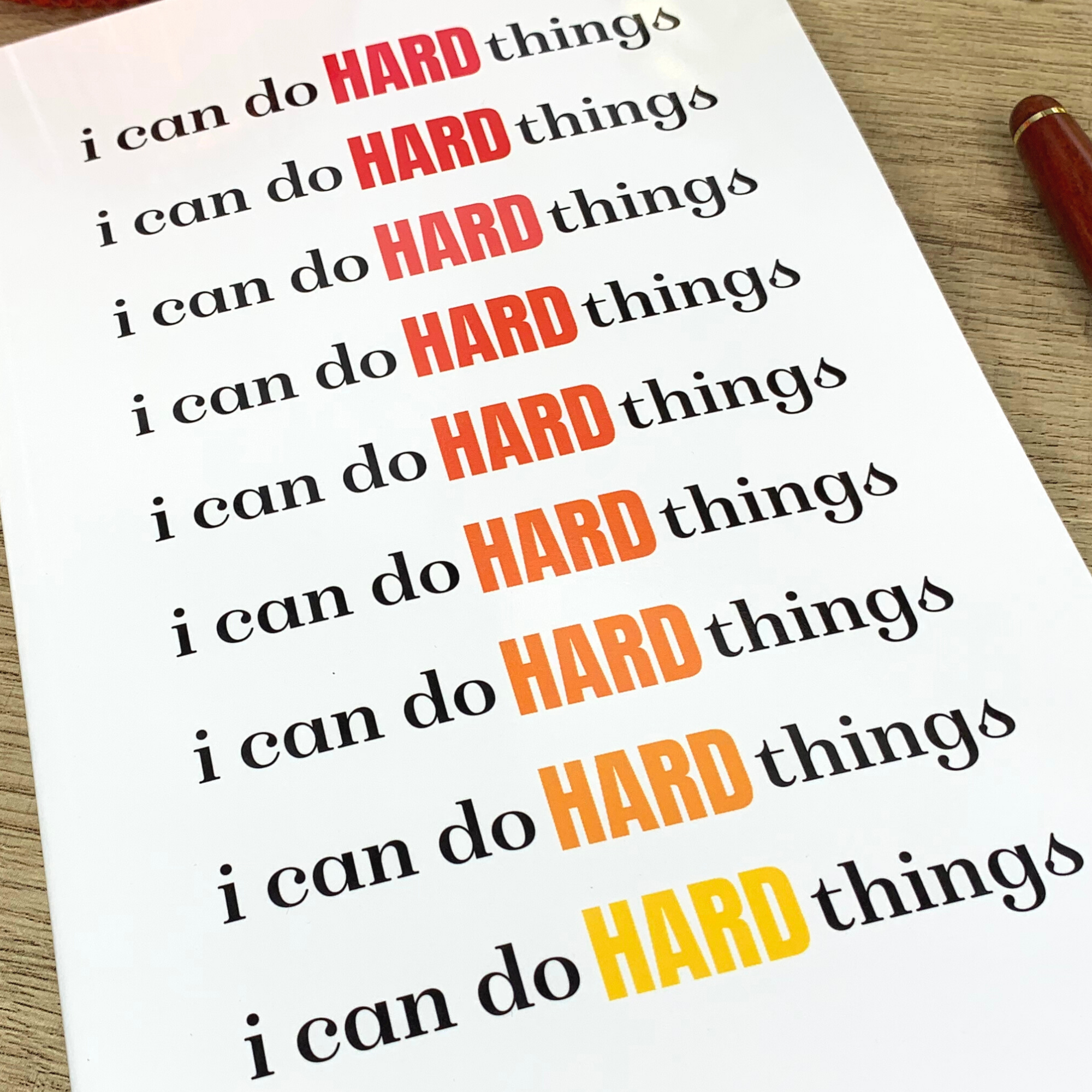 Never forget that your struggles become the source of your greatest strength! Keep yourself pumped up on the journey with this beautiful journal featuring the repeating phrase, ”I can do HARD things” printed in black with pink/red/orange/yellow gradient colored text against a glossy white background.