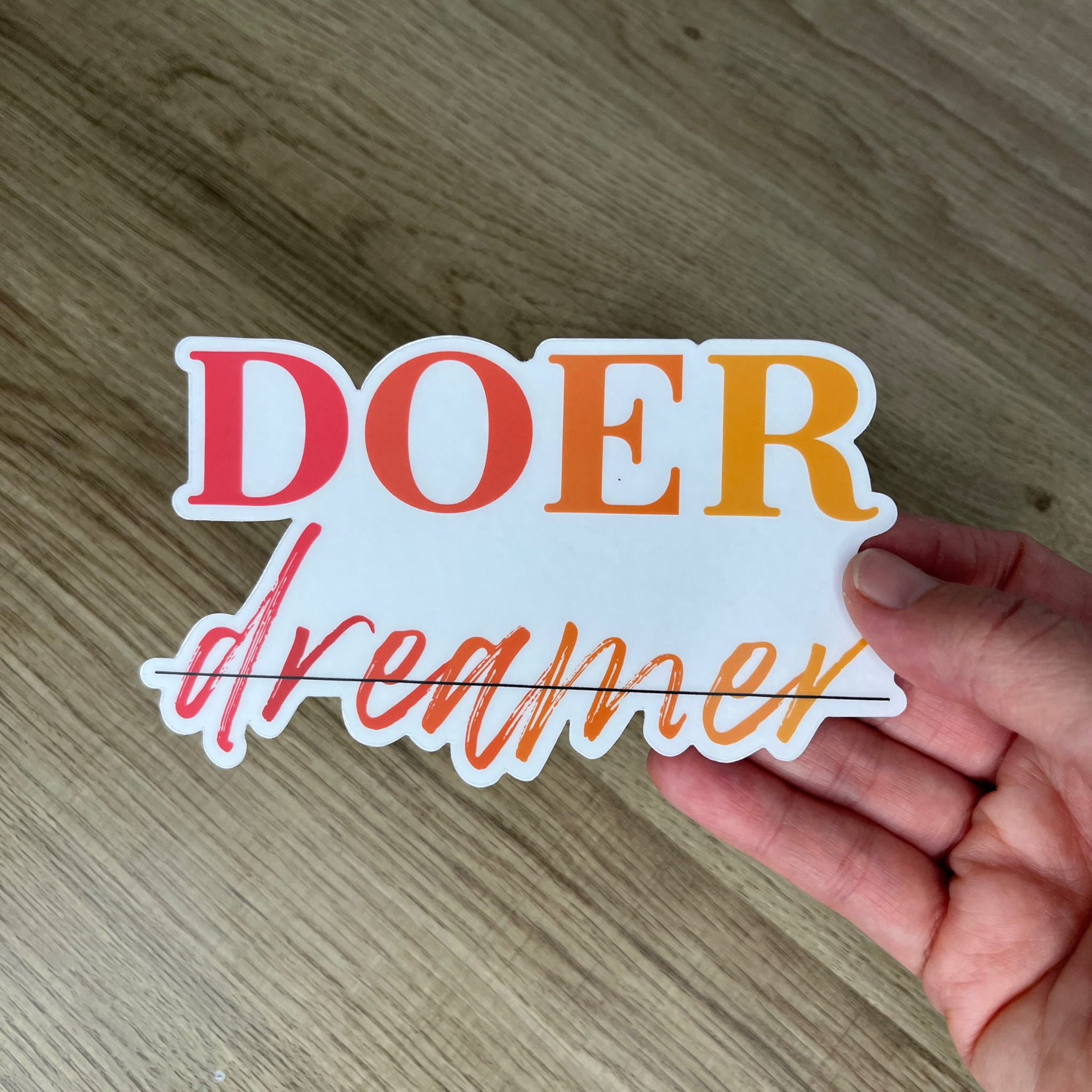 Premium clear die-cut vinyl sticker with the word “dreamer” crossed out and replaced with the word “DOER” in bold red-orange gradient colors.